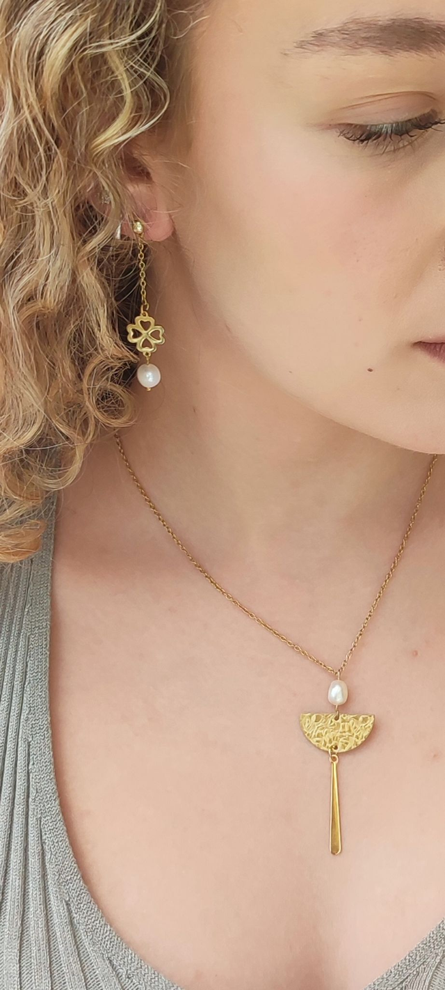 Ce collier délicat en acier inoxydable doré allie modernité et élégance. Il se compose d’une perle d’eau douce surmontant un pendentif en demi-lune texturée. Une fine tige dorée suspendue apporte légèreté et mouvement à l’ensemble. À la fois minimaliste et raffiné, il sublimera aussi bien une tenue du quotidien qu’un look plus habillé. Idéal pour celles qui aiment les bijoux discrets avec une touche d’originalité.