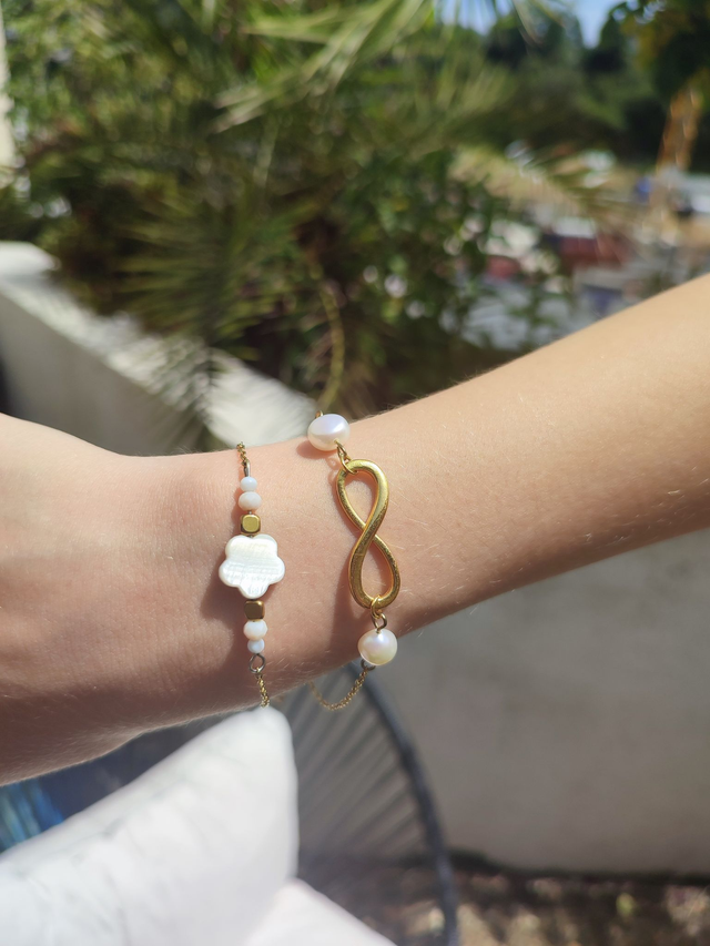 Le bracelet "Fleur Blanche" incarne la pureté et l’élégance avec une touche solaire. Sa fleur centrale en coquillage irisé est mise en valeur par des perles blanches assorties et des hématites dorées, le tout monté sur une chaîne fine en acier inoxydable doré. Intemporel et raffiné, il peut être porter seul pour une touche délicate ou en 'stacking' pour un look affirmé et ultra-tendance.