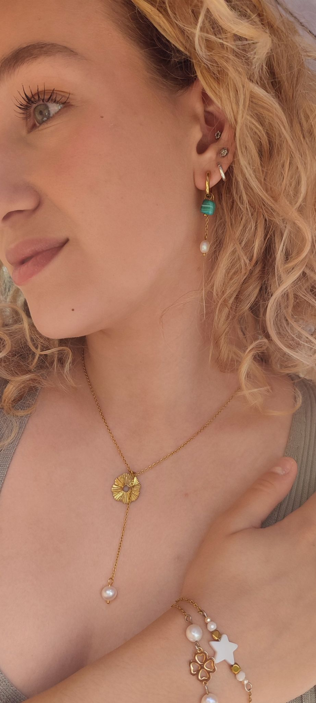 Ce collier délicat se compose d'une chaîne fine dorée en acier inoxydable ornée d'un pendentif en forme de fleur plissée, accompagné d'une perle d'eau douce suspendue à son extrémité. Une pièce élégante et emprunte de légèreté, parfaite pour ajouter une touche d'originalité à n'importe quelle tenue.