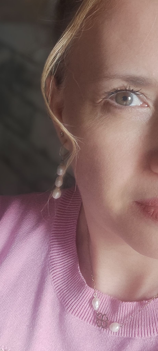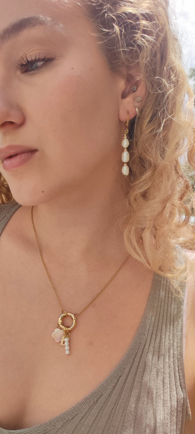 Ces boucles d'oreilles se distinguent par leur élégance et leur agencement harmonieux avec une base demi-anneau doré en acier inoxydable, trois perles d'eau douce suspendues en cascade agrémentées de petites perles en verre roses nude irisées et des finitions dorées en hématite.
